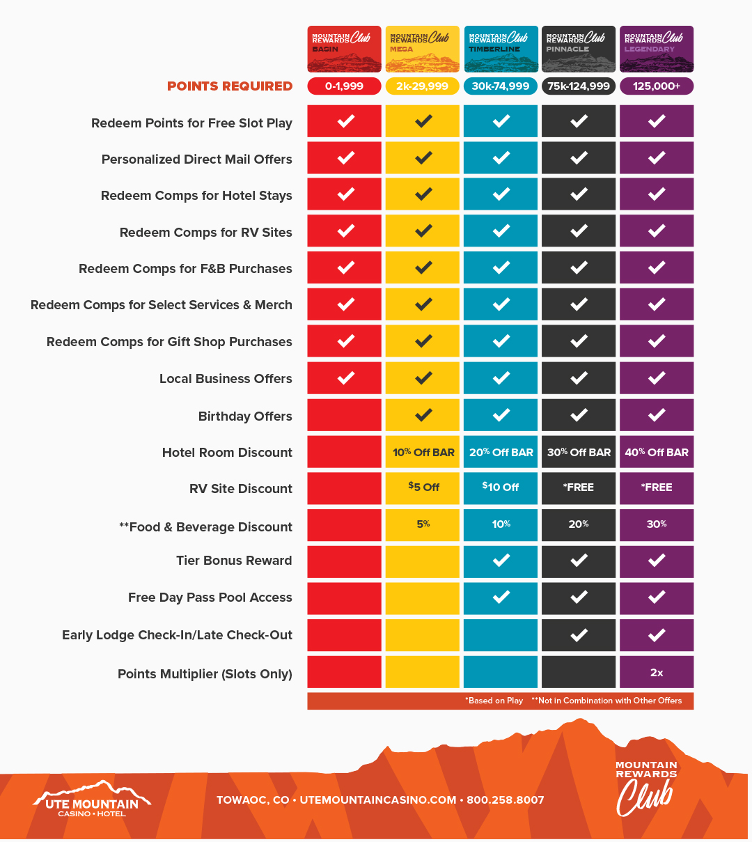 When you play with your Mountain Rewards Club card at Ute Mountain Casino Hotel, you earn points that can be redeemed for meals, hotel rooms and merchandise plus enjoy members-only promotions and specials. The more you play and the higher tiers you achieve, the more benefits will be available for you to enjoy. Visit the Mountain Rewards Club today to enroll. We can’t wait to welcome you to the best rewards club in Colorado!